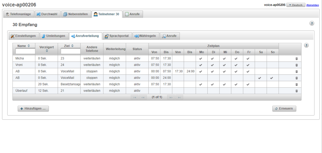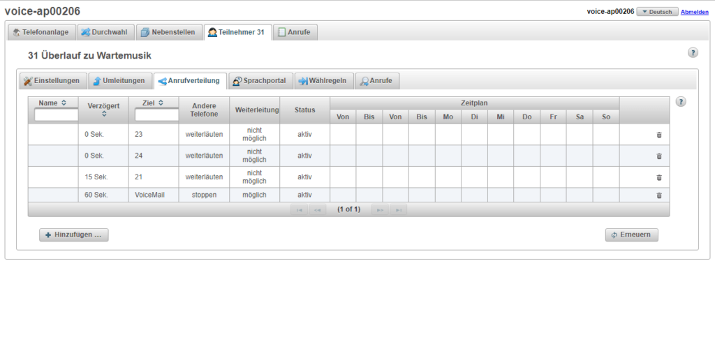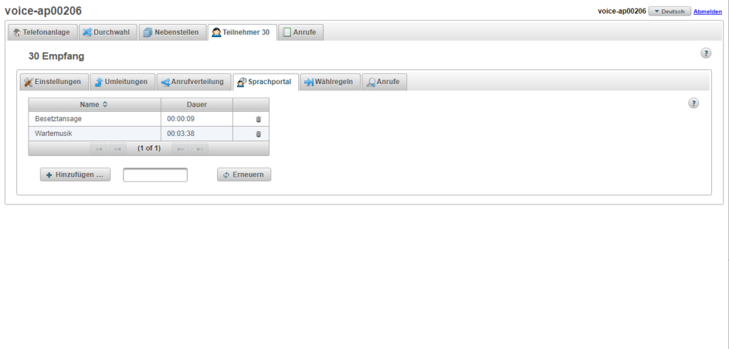 Dann in der Anrufverteilung für diese Nebenstelle nach der gewünschten Verzögerung eine Weiterleitung auf die Besetztansage einrichten. Nicht vergessen, über das Sprachportal die Nachricht aufzusprechen. Gleichzeitig auch die gewünschte Wartemusik hochladen, wenn man schon im Sprachportal drin ist.
