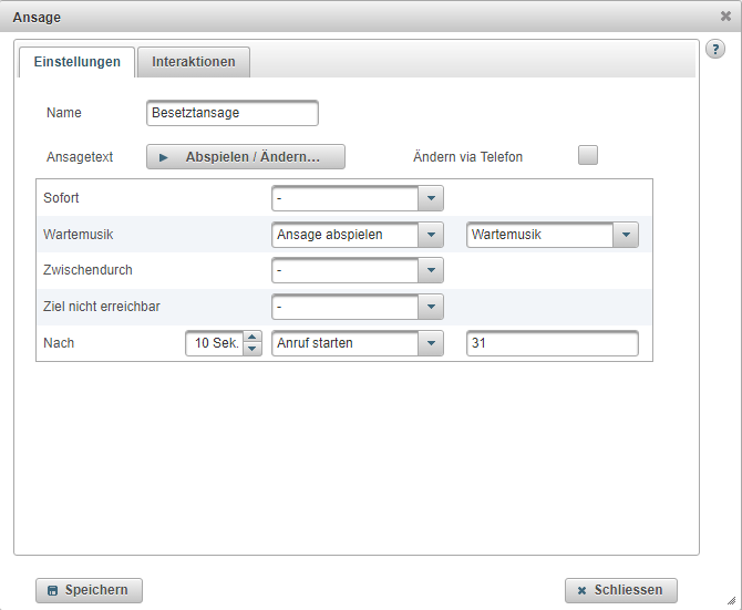 Im Sprachportal für diese Nebenstelle auf den Eintrag für die Besetztansage klicken und unter Wartemusik die gespeicherte Wartemusik abspielen mit der Einstellung Ansage abspielen. Unter Nach wird dann nach der gewünschten Zeit die Option Anruf starten aktiviert und auf die nächste Gruppe weitergeleitet.