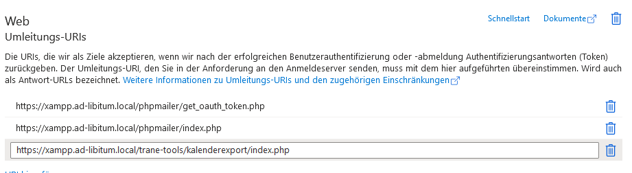Bei der Redirect-URI ist übrigens unerheblich, ob diese öffentlich erreichbar ist oder nicht. Sie muss lediglich auf dem lokalen System erreichbar sein. Und es können mehrere URIs eingetragen werden. Auf Systemen ohne SSL die URI trotzdem mit https eintragen und auch so aufrufen.
