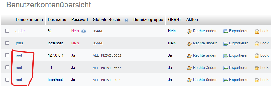 Damit der Zugang zu phpMyAdmin nicht mehr ohne Passwort möglich ist, zunächst den User root mit einem Passwort versehen: