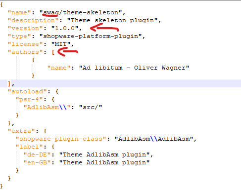 Zu finden ist das Theme dann unter custom/plugins/AdlibAsm. Dort in der composer.json ein paar Änderungen vornehmen: