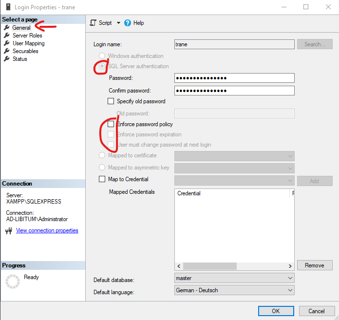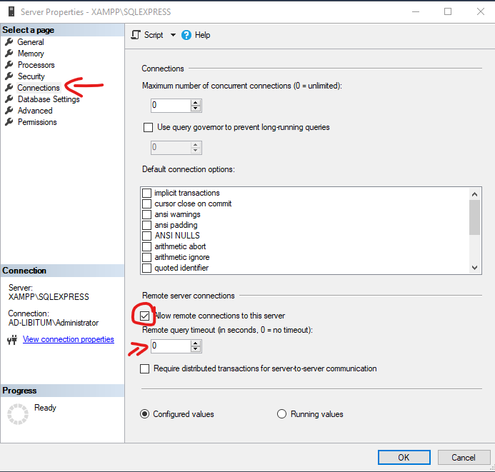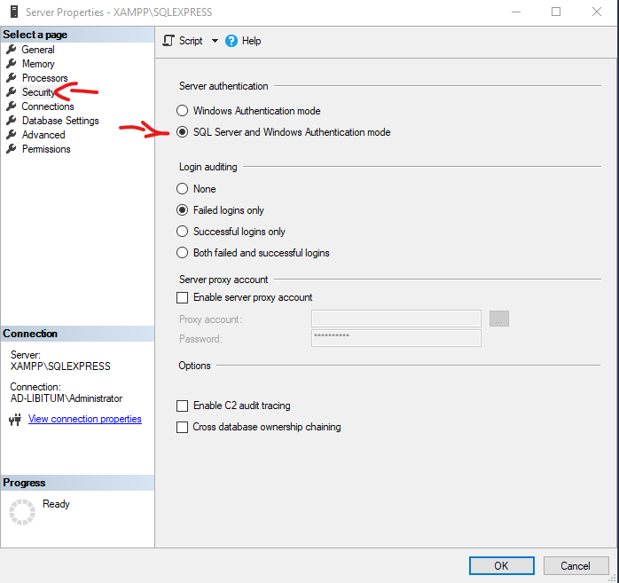 Auf dem Server im SQL Server Management Studios (SSMS) einen Rechtsklick auf den Server machen, Einstellungen wählen und unter Security diese Einstellungen vornehmen:
