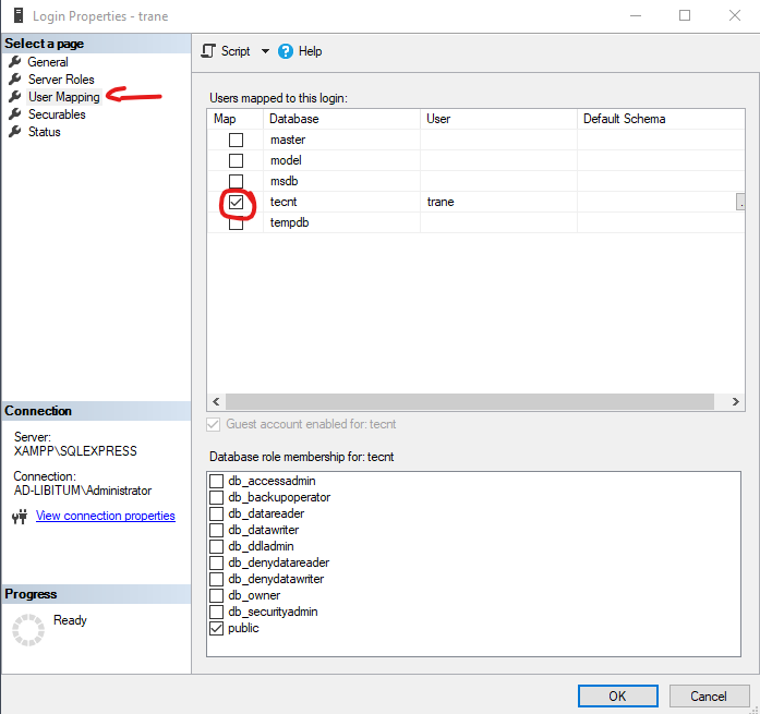 Bei diesem User unter User Mapping darauf achten, dass die gewünschte Datenbank aktiviert ist:
