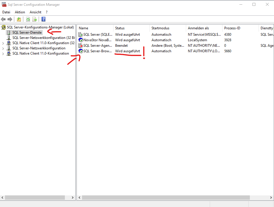 Hier zunächst die SQL Server-Dienste prüfen. Der SQL Server-Browser muss laufen. Der lässt sich an dieser Stelle vermutlich nicht aktivieren. Daher im Dienstemanager starten.