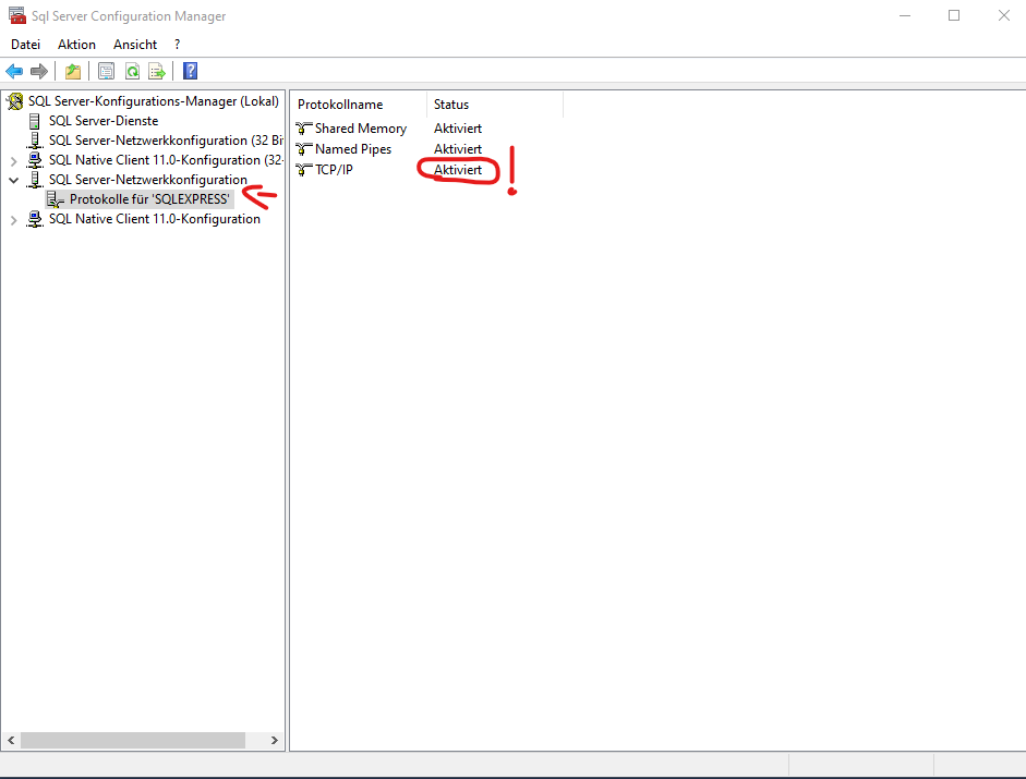 Anschließend unter SQL Server-Netzwerkkonfiguration die aktivierten Protokolle für den betreffenden serverprüfen. Mindestens TCP/IP muss aktiv sein: